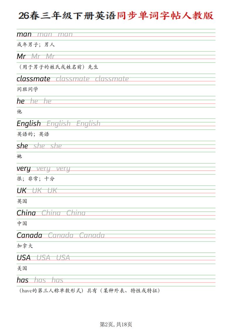 三下人教PEP版英语同步单词字帖-独家科技资源网